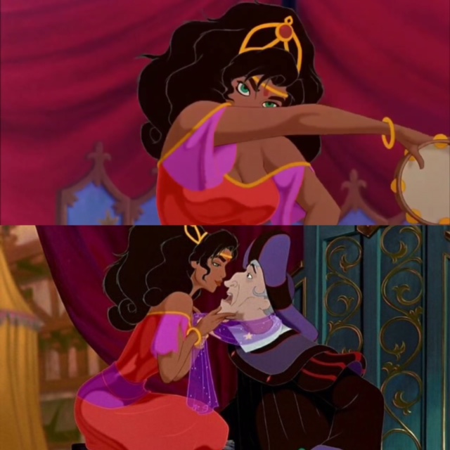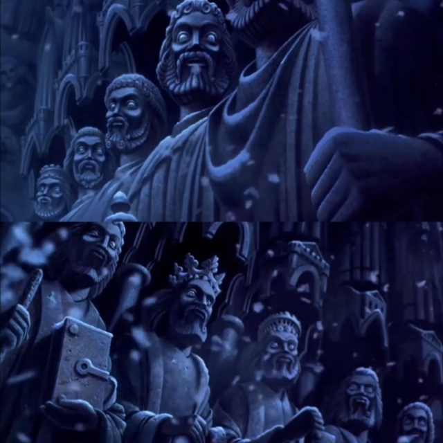 ディズニーアニメのカジモドは外見は醜いが、心優しい青年に描かれ、大聖堂のアーチから溢れる光、日の光が照らす街へと夢を見る。原作では孤児だったカジモドはアニメの中では“Sanctuary, please give us sanctuary”と母に守られたという過去を持つように加えられた。