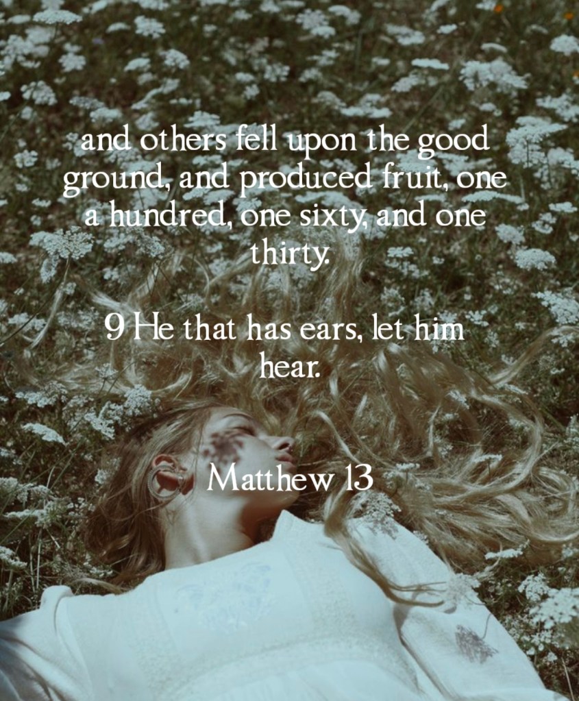 And that [same] day Jesus went out from the house and sat down by the sea. And great crowds were gathered together to him, so that going on board ship himself he sat down, and the whole crowd stood on the shore. And he spoke to them many things in parables, saying, Behold, the sower went out to sow: and as he sowed, some [grains] fell along the way, and the birds came and devoured them; and others fell upon the rocky places where they had not much earth, and immediately they sprang up out of [the ground] because of not having [any] depth of earth, but when the sun rose they were burned up, and because of not having [any] root were dried up; and others fell upon the thorns, and the thorns grew up and choked them; and others fell upon the good ground, and produced fruit, one a hundred, one sixty, and one thirty. He that has ears, let him hear. Matthew 13:1~9
